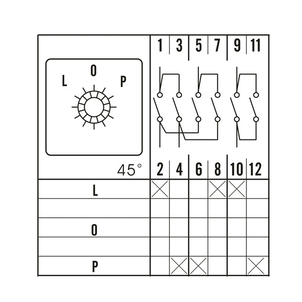Three-phase, three-position (Forward-Off-Reverse/ L-O-P) switch used to manually control a motor’s direction of rotation. Operating the switch changes the wiring configuration of the motor to operate in the forward or reverse direction.